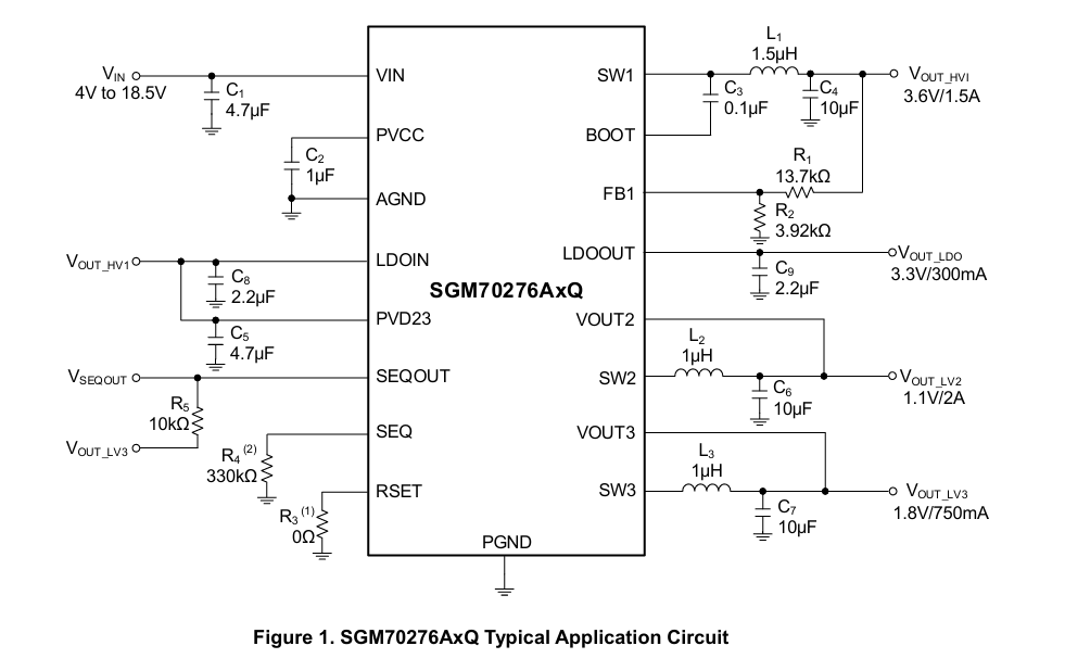Features: HVBuck1: 4–18.5 V input, up to 1.5 A output.